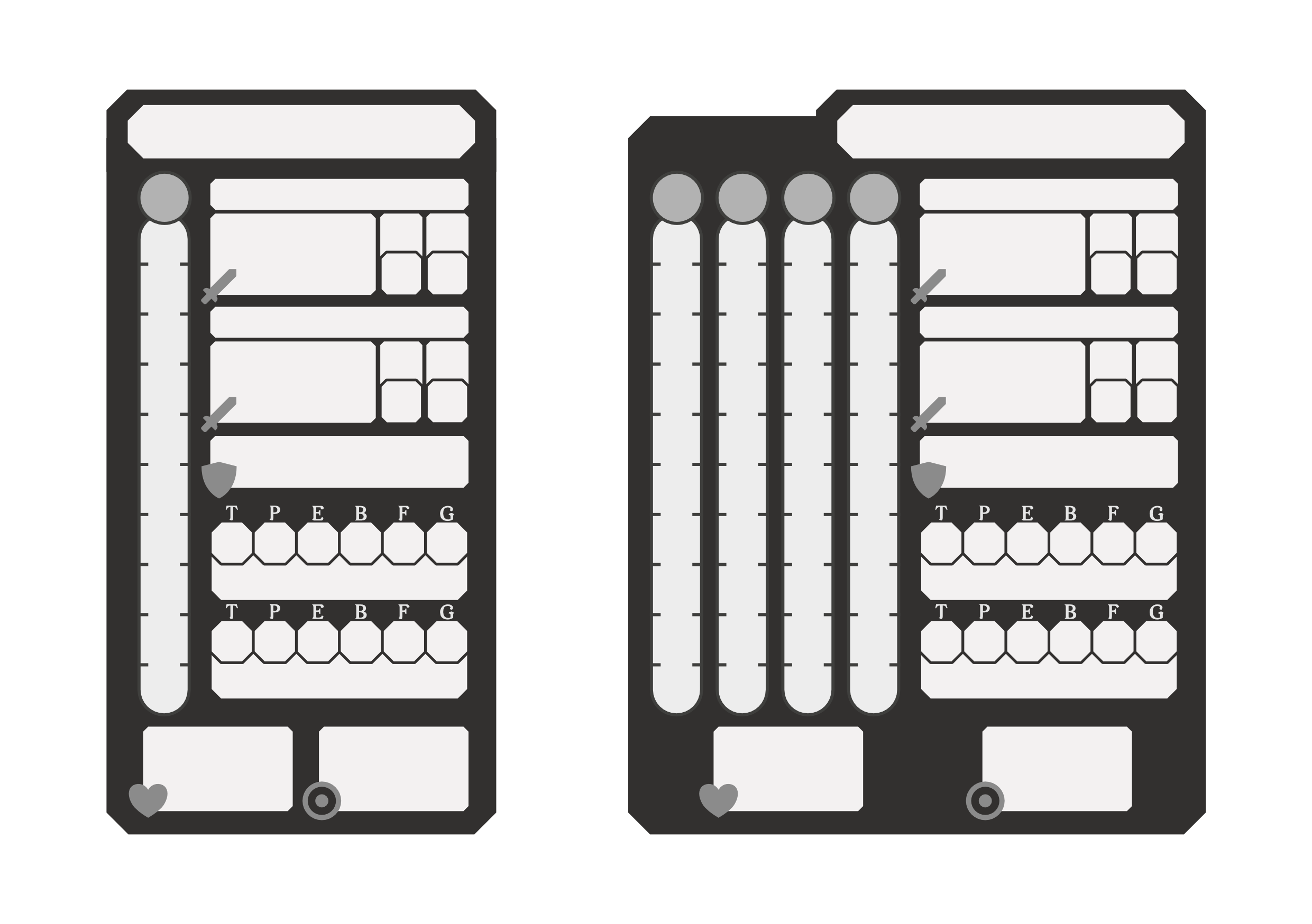 Ces schémas sont des Jauges de Trauma configurables, qui vous permettent de les faire correspondre à la résilience de vos personnages non-joueurs. Sur cette fiche vous avez la possibilité de gérer le Trauma de quatre entités distinctes.