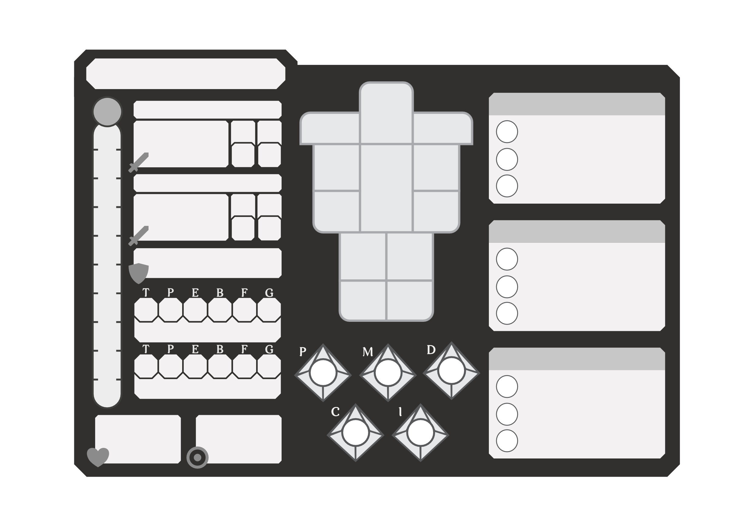 Cette partie représente l’Arsenal des armes dont vous disposez. Vous pourrez utiliser deux sets d’armes à la fois : Principales et Secondaires. Chaque colonne dans ses sets représente votre main dominante et non dominante. Si l’arme s’utilise à deux mains, laissez vide la deuxième colonne. Vous pourrez inscrire toutes les propriétés de votre arme, en particulier les Dégâts qu’elle peut infliger en fonction du Type de Dégâts. T, P et E signifient respectivement Tranchant, Perforant et Écrasant. Les emplacements sans lettre associée laisse une place pour ajouter un Type de Dégâts non compris dans ces trois derniers. L’emplacement en dessous est pour noter la Portée de l’arme, et le suivant est pour l’Atout qu’elle vous confère.